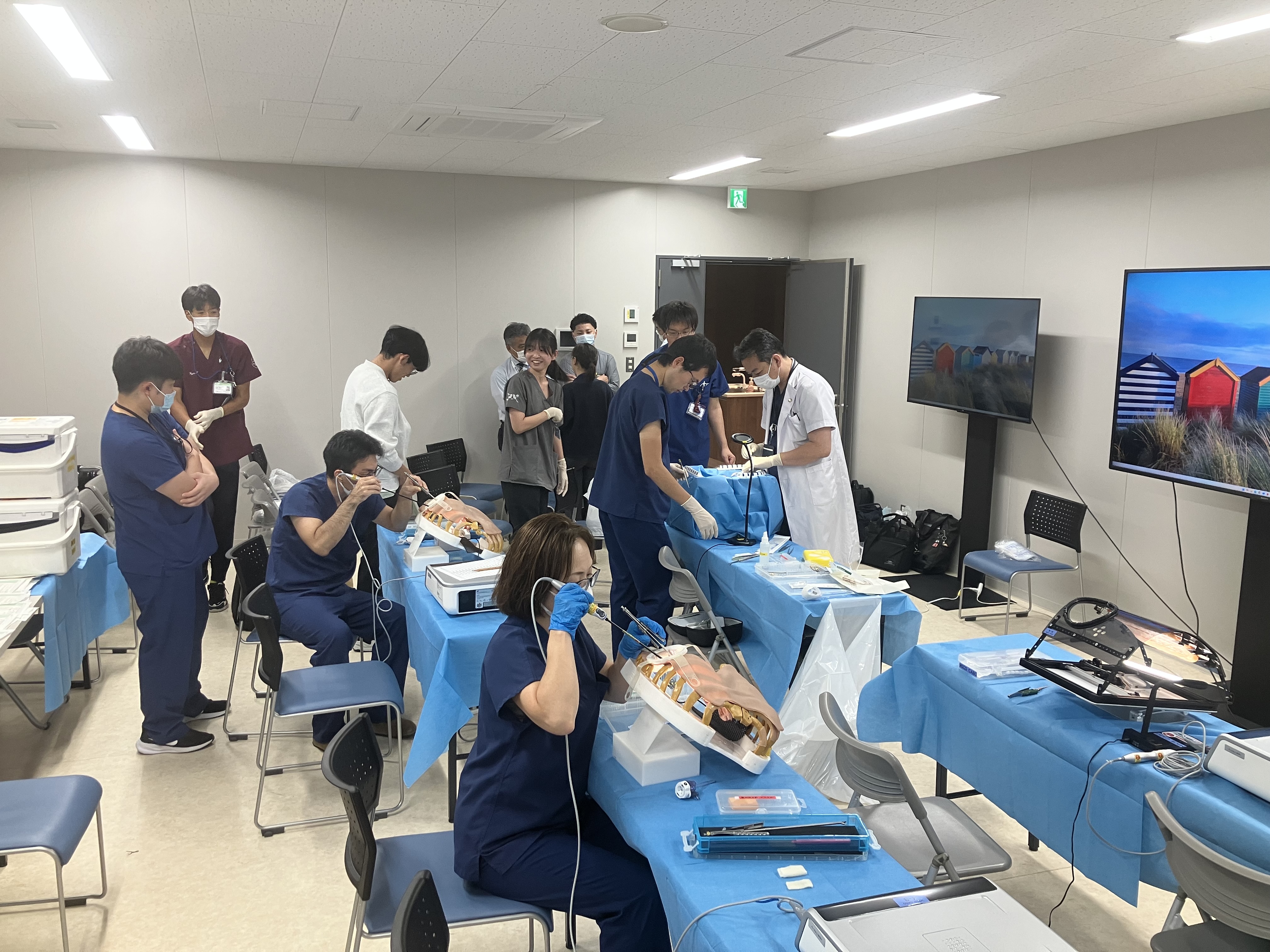 2025年9月2日、当科医局カンファレンス室においてカニュレーショントレーニングを実施しました。心臓血管外科医を目指す修練医と学生さんが参加し、エコーガイド下における穿刺やカニューレ挿入の際の注意点など手技を通して勉強することができました。学生さんも楽しそうでした!