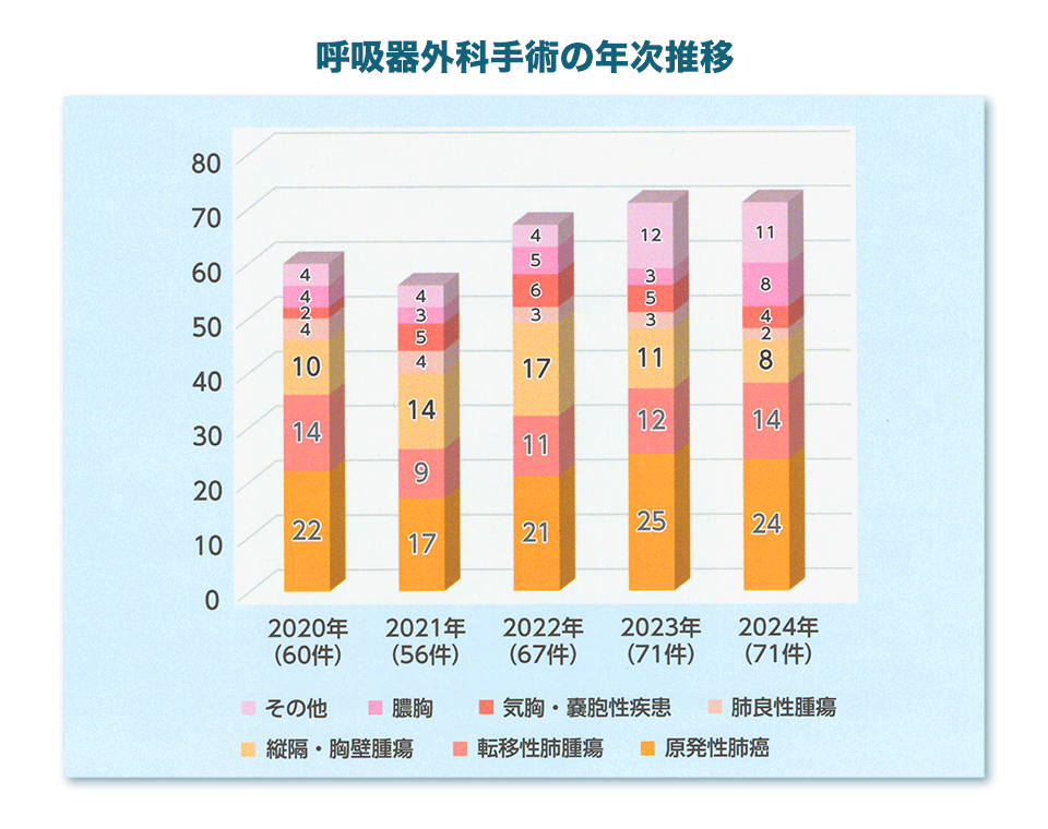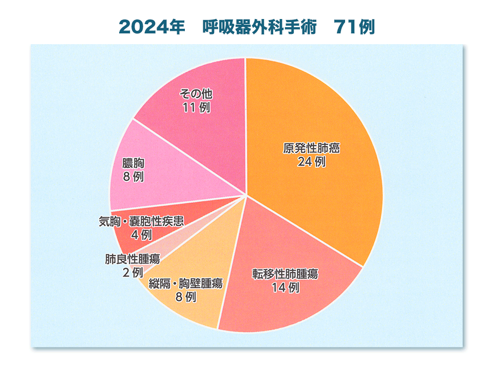 呼吸器外科は2024年胸部外科学術調査では肺癌手術件数23件と例年と総数に変化ありません。しかし術式が葉切除術10例に対して、区域接受御術が9例と区域切除術の割合が増えています。